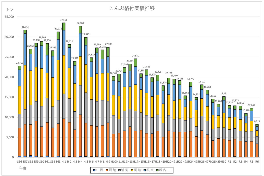 国内産の昆布の約95%を北海道産が占めており、最盛期には3万トンを超えることもあったが、最盛期の1989年(平成元)に33505トンあった生産量は、2024年度には8213トンと1/4にまで減少した。