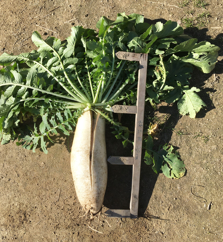収穫した田辺大根 大根の高さ48cm、胴回り42cm、重さ6.8kg