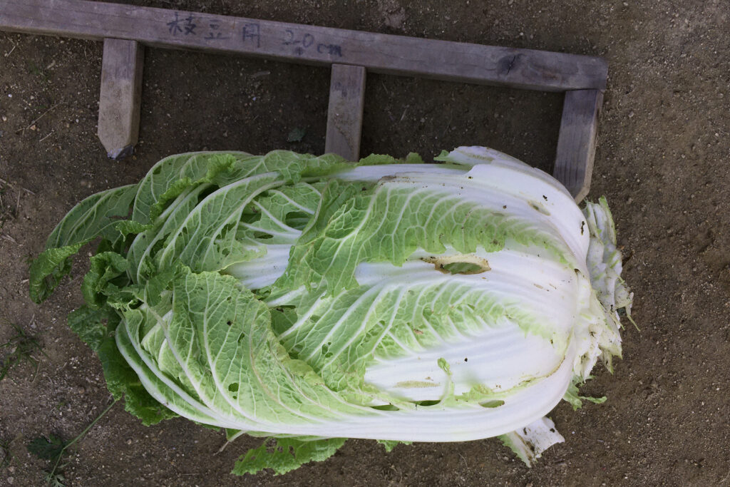 で、こうした成長し過ぎたものは大根だけでなかった。2週間ほど前に収穫した白菜も大きかったのだが、まだ巻きが柔らかいものを置いていたら、それが大きくなり過ぎていた。これも外葉を取った状態で高さが40cm以上、重さ4.2kg。まぁ昔はこのくらいの大きさのものが市場で売っていた記憶があるのだが、最近はここまでのものは一般市場で見ることは少なくなっている。大根もそうなのが、同じ畝の中でも、大きなっているものもあれば、まだ発育中のものもあるのだが、相対的に例年に比べて著しく成長している率が高い。11月後半になって気温は例年並みになってきたように思うが、10月いっぱいが高温で推移してきたことも影響しているかと思われる。