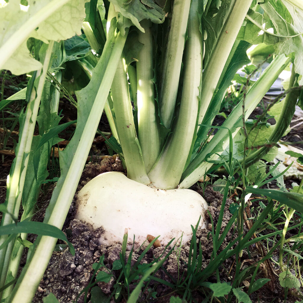 直径15cmほどに成長した蕪。 天王寺蕪が土地の特性で変異したという野沢菜のように茎が太い