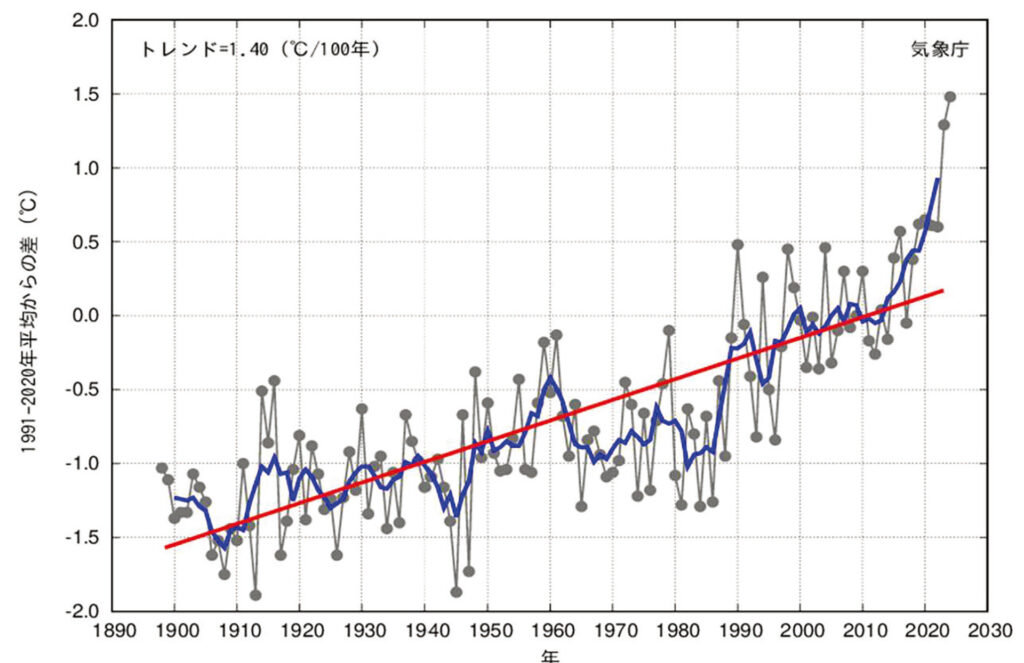 日本の平均気温は長期的に上昇を続け、2024年には統計開始以来最高を記録した。気象庁は、「日本の年平均気温は、様ざまな変動を繰り返しながら上昇しており、長期的には100年あたり1.40℃の割合で上昇」していると述べている。これに伴い、熱中症による死亡者数は30年で約6倍に増加している。このほか、豪雨・土砂災害、農林水産業の被害、物価上昇などが国民生活を直撃している 。