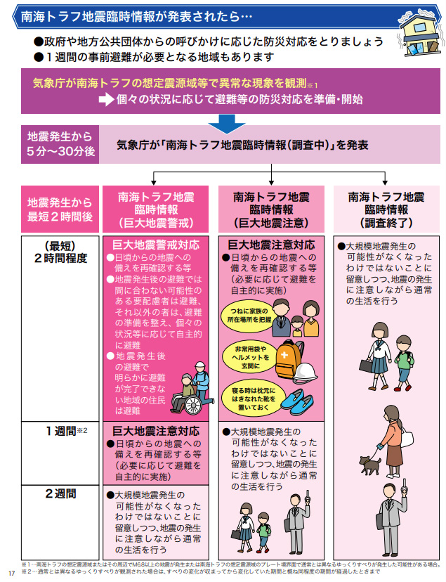 南海トラフ地震臨時情報に関しては、気象庁のサイトに「南海トラフ地震臨時情報」が発表されたときの防災対応、というページがある。