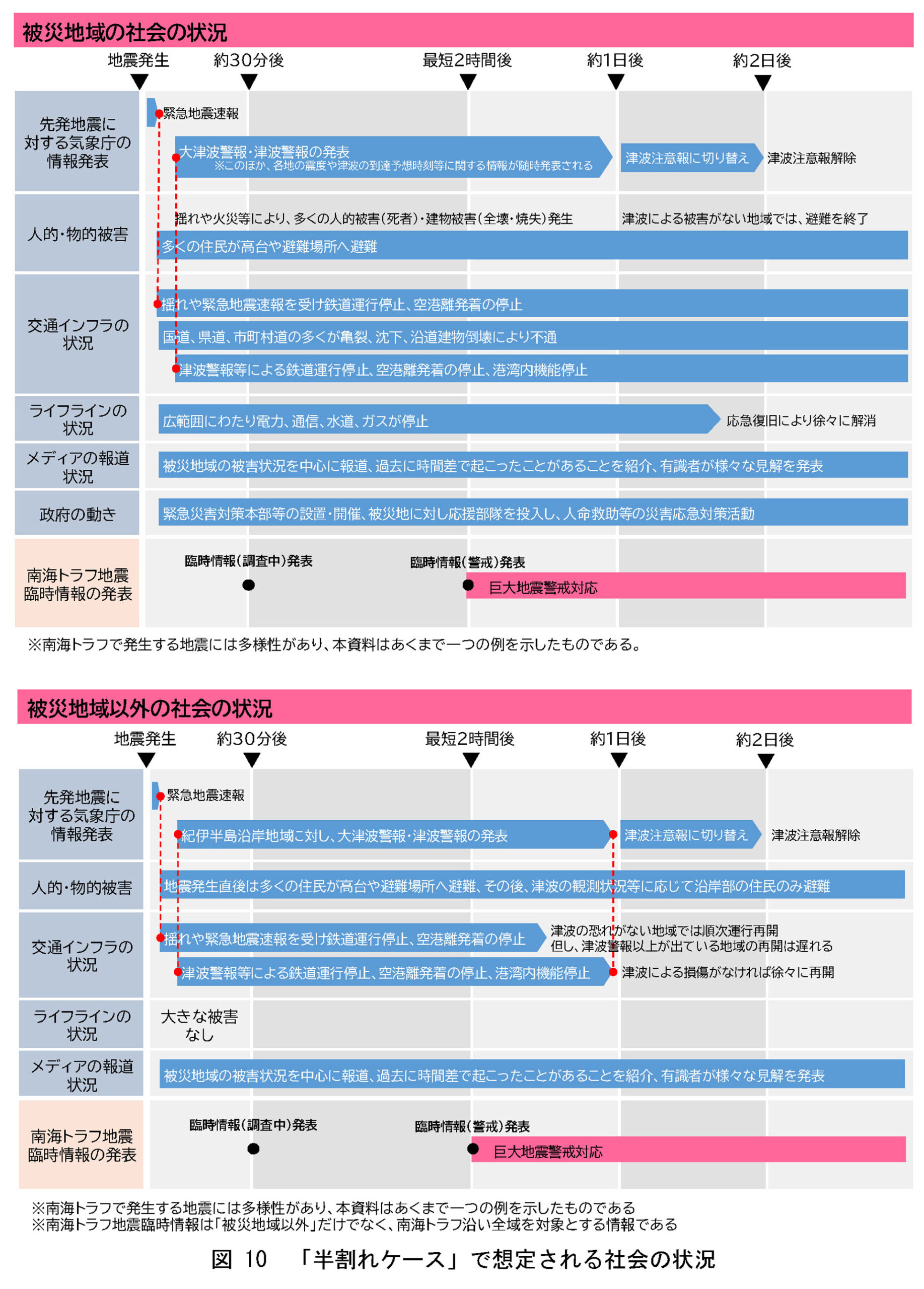 内閣府のページにある「南海トラフ地震臨時情報防災対応ガイドライン(令和7年8月改訂)」という資料の中に「半割れケース」で想定される社会の状況を解説した箇所があり、「被災地域の社会の状況」と「被災地域以外の社会の状況」という内容が地震発生から約2日後まで時系列で記載されているものがある。
