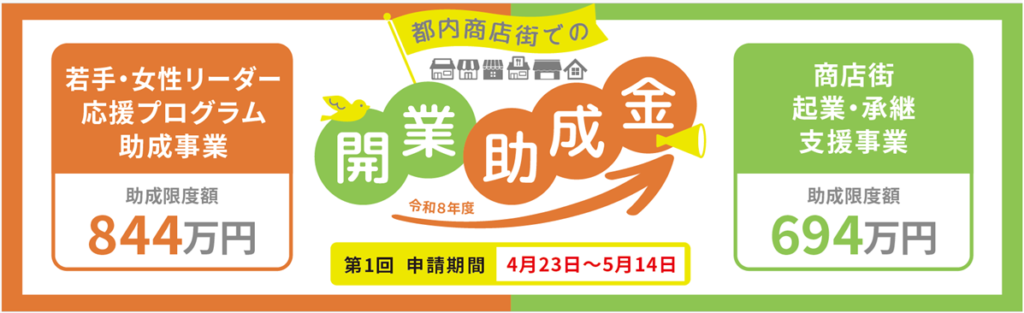 商店街起業・承継支援事業は最大約694万円、若手・女性リーダー応援プログラム助成事業は最大884万円である。一店舗の補助でこの規模が出る制度は、大阪府・大阪市の現行メニューには存在しない。