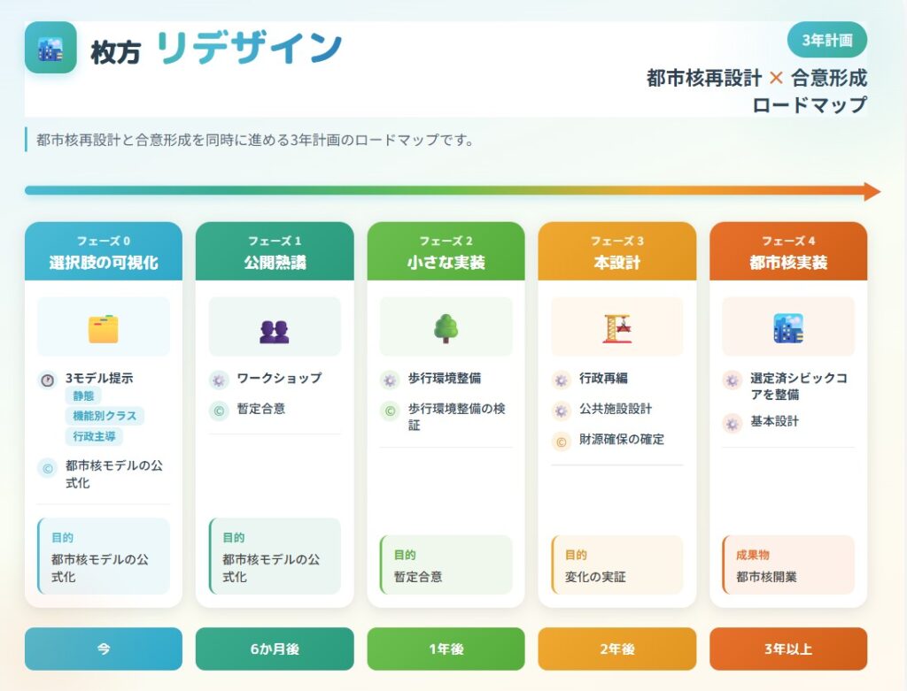 ここでは、「連結型シビックコア」という空間構想を、現実に落とすための三年ロードマップを提示する。ポイントは、拙速に結論を出さないこと、しかし時間を無為にしないことである。