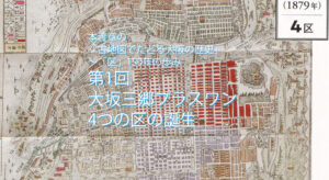 幕末の大阪の中心地であった「大坂三郷」を基礎としながらも、3つではなく「北区」・「東区」・「南区」・「西区」の4つの区から始まり、近代化や戦後復興、人口爆発を経て現在の24区となった経過を「区」の成長(=大阪市の成長)という視点から描かれた「古地図でたどる大阪24区の履歴書」に触発されたテーマです。